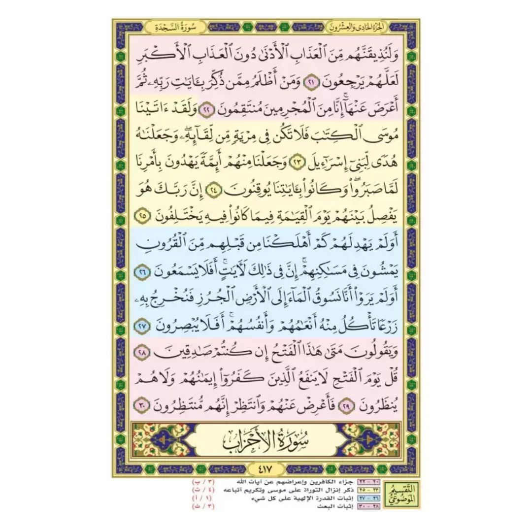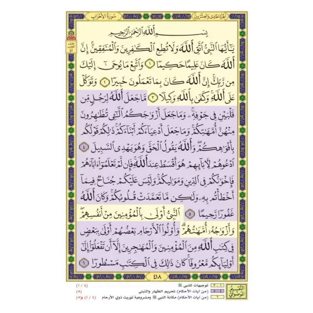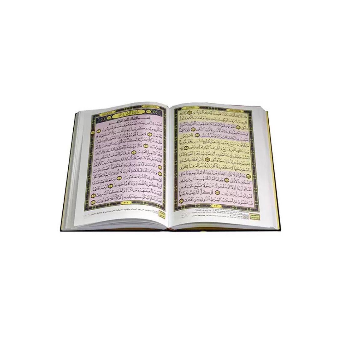 Chaque page est structurée à l’aide d’un code couleur intelligent qui divise le texte selon les différents thèmes abordés. Cette approche permet au lecteur d’associer chaque verset à une couleur spécifique, favorisant ainsi une compréhension immédiate, claire et objective du sens des versets au fil de la lecture.