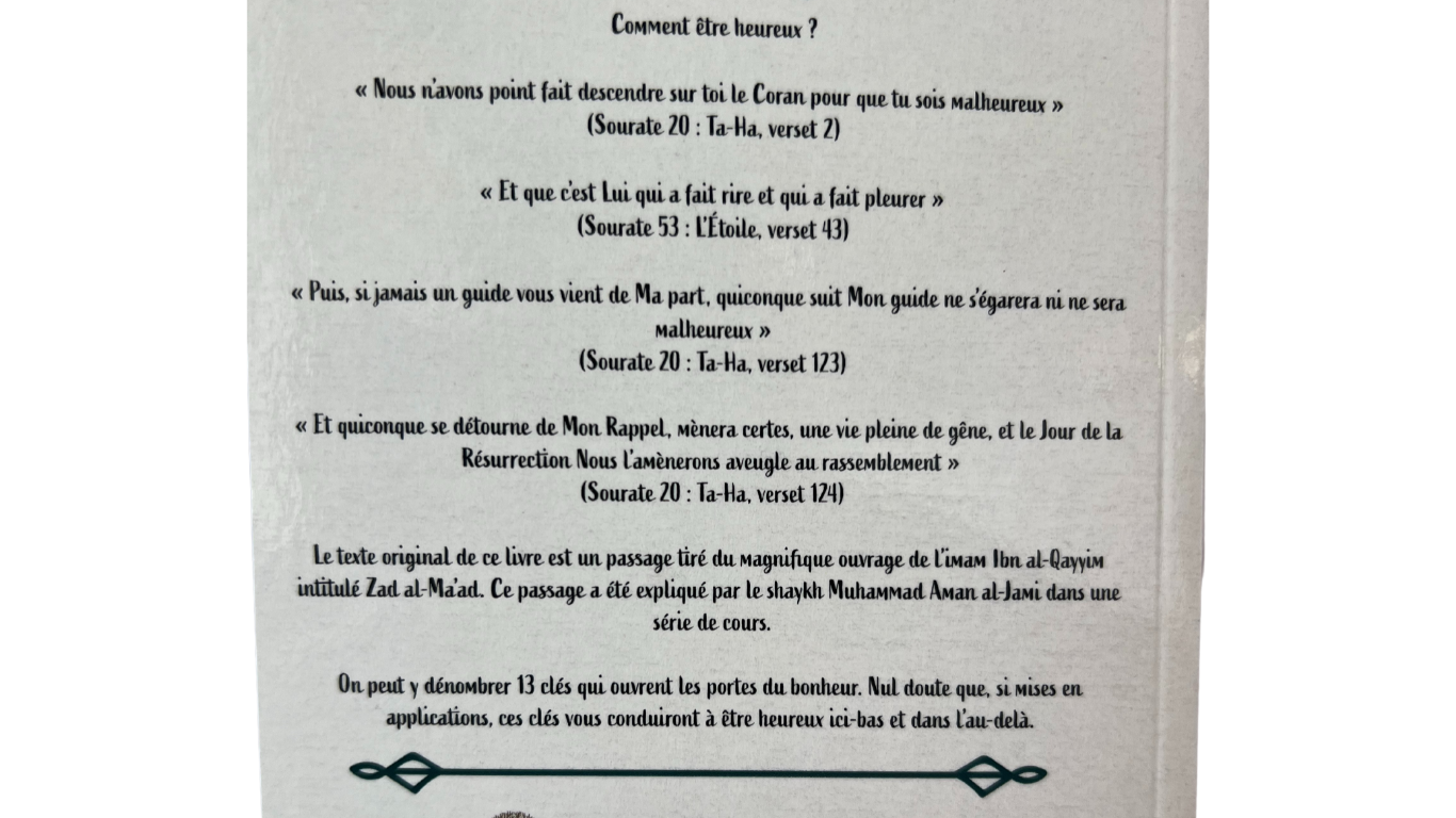 Ce texte évoque les clés du bonheur, en se basant sur des versets coraniques et des explications de grands érudits. Il souligne que le Coran n’a pas été révélé pour rendre les gens malheureux, mais pour les guider vers le bonheur. Il met en lumière l’importance de suivre le guide divin pour éviter le malheur, tout en mettant en garde contre le détournement du rappel d’Allah, source de misère. Ces enseignements, tirés de l’ouvrage “Zad al-Ma’ad” de l’imam Ibn al-Qayyim, ont été expliqués par le shaykh Muhammad Aman al-Jami à travers 13 clés pour ouvrir les portes du bonheur, offrant ainsi une voie vers le contentement dans cette vie et dans l’au-delà.