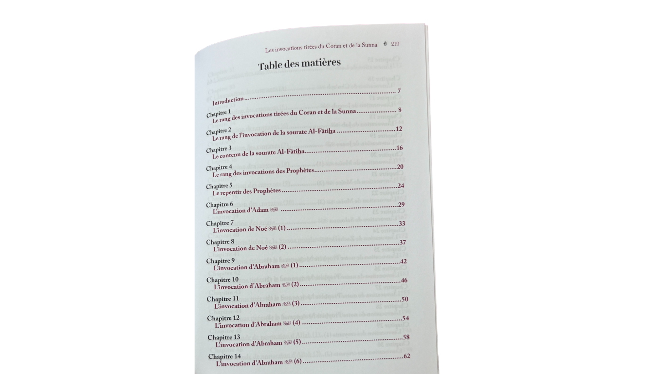Les invocations coraniques des Prophètes et Messagers sont surtout mises à l’honneur, avec un commentaire expliquant les circonstances de ces prières et leurs termes. Pour ce qui est des invocations tirées de la Sunna, elles sont pour la plupart générales et non liées à des circonstances particulières.