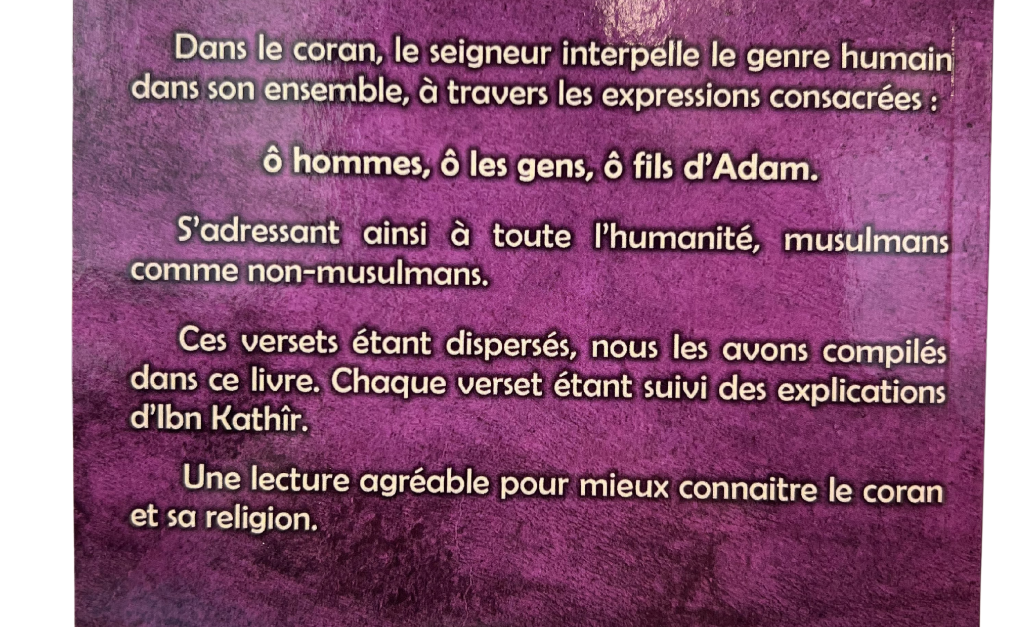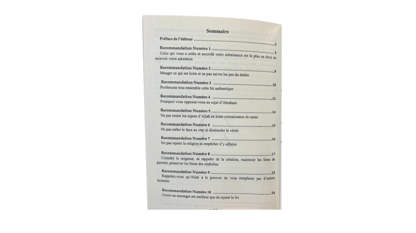 Les Recommandations Divines” est un livre de la série “Le meilleur de l’Imam Ibn Kathir”, édition des Savants. Il compile les versets du Coran où le Seigneur s’adresse à l’humanité dans son ensemble, utilisant des expressions telles que “ô hommes”, “ô les gens”, et “ô fils d’Adam”. Ces versets, destinés aussi bien aux musulmans qu’aux non-musulmans, sont dispersés dans le Coran, mais ont été regroupés dans ce livre. Chaque verset est suivi des explications d’Ibn Kathîr, offrant ainsi une lecture agréable pour mieux comprendre le Coran et la religion islamique.